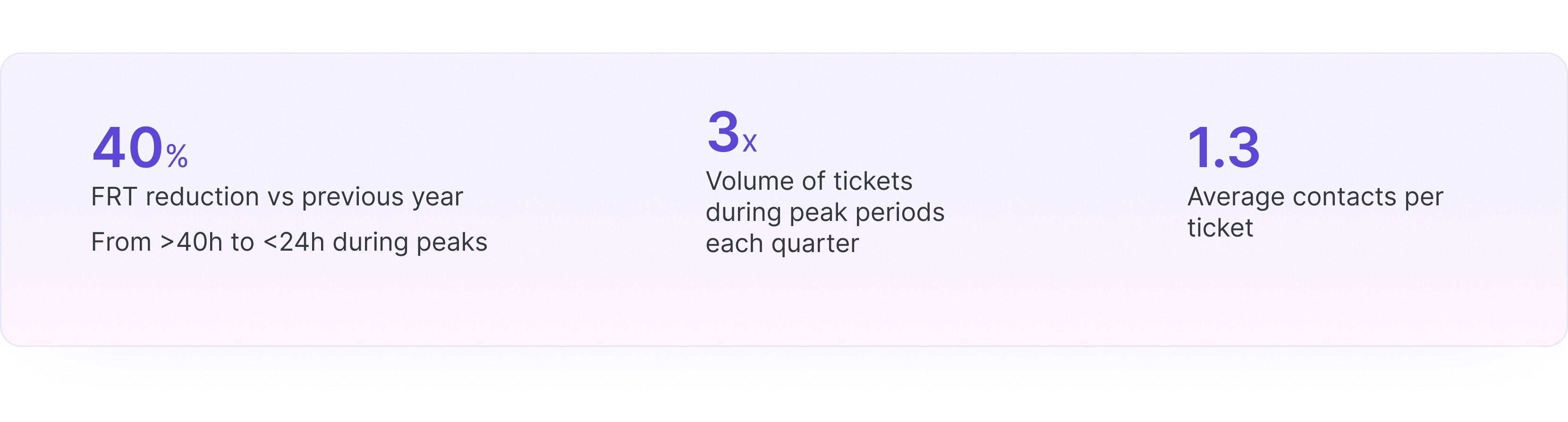 Speed (FRT) | 48% YoY reduction in First Response Time, with Q4 average reduced to 29 hours. 85% of tickets were answered within 48 hours, even during peak periods. |