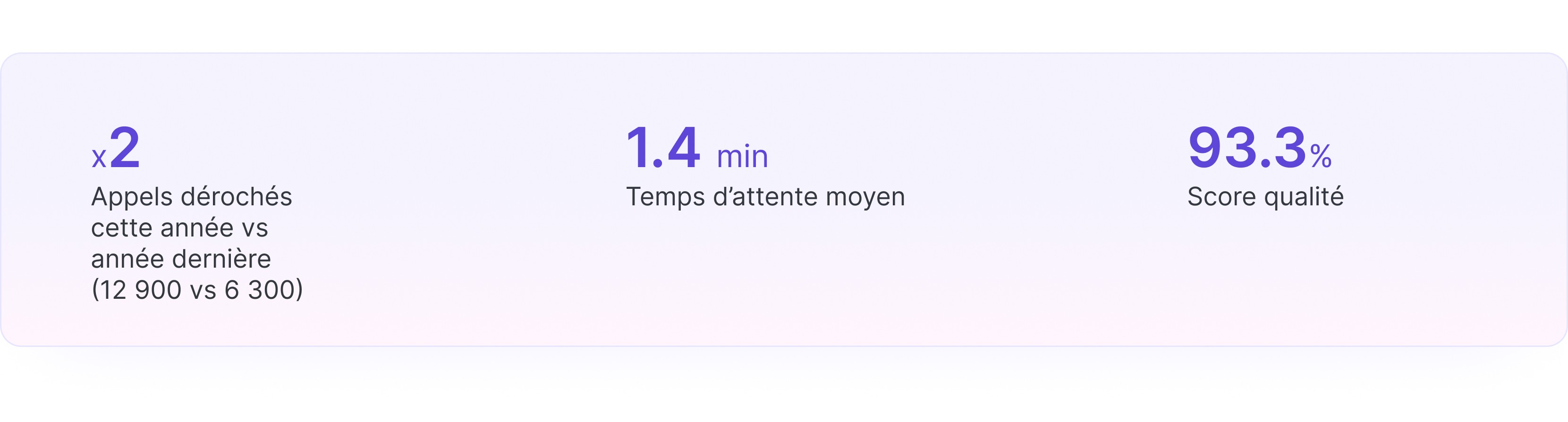 Appels répondus : passant de seulement 44,5 % en 2024 à 78,7 % au cours des 3 derniers mois. 12 900 appels traités depuis le début de l'année contre 6 300 pendant la même période l'année dernière → augmentation de 100 % des appels répondus.